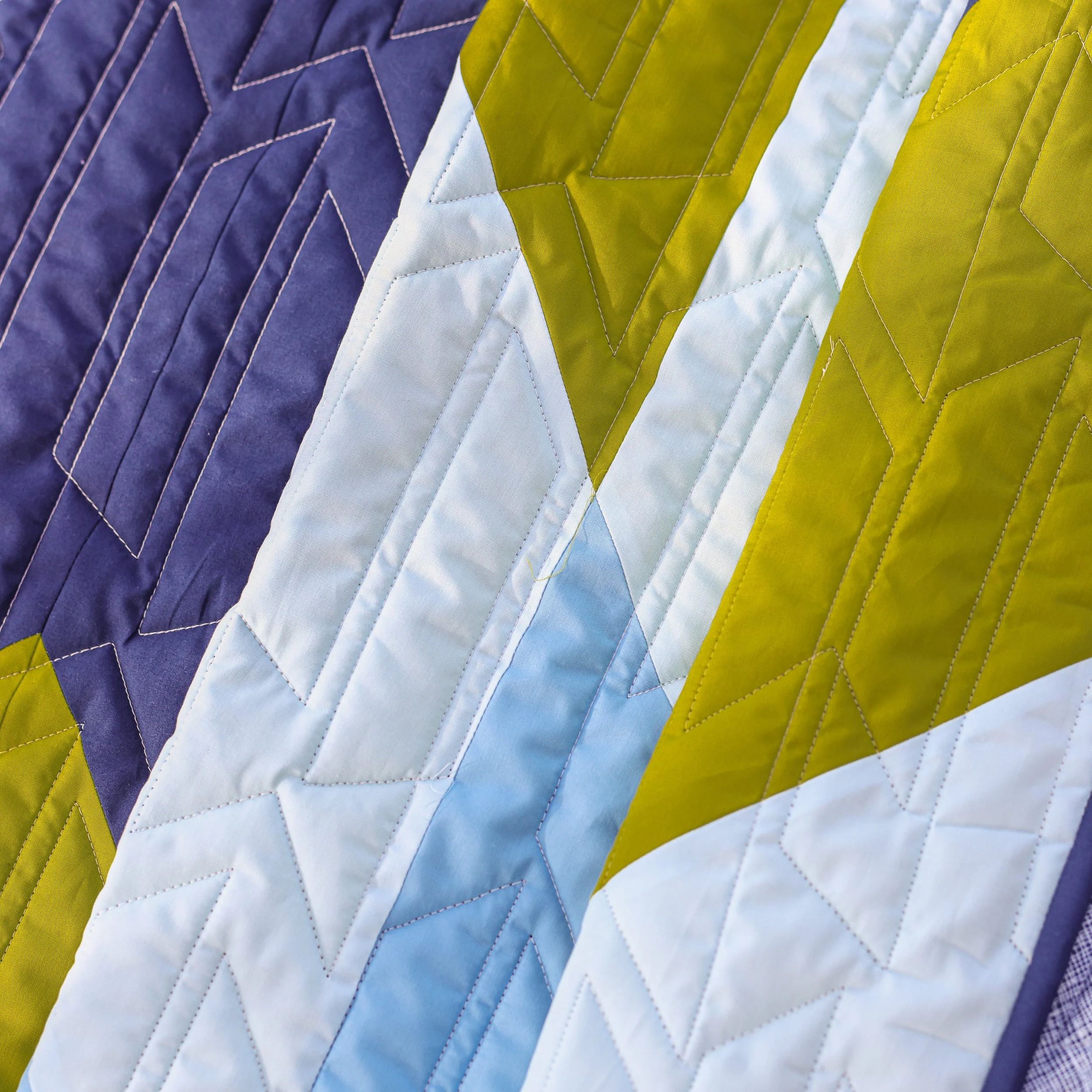 Lilo quilted our sample using a panto called Wright Panes (designed by Jessica Schick), which has lines very similar to the quilt pattern’s. It’s such a perfect combination! For the binding, she used the beautiful navy Art Gallery Pure Solid in Heart of the Ocean.